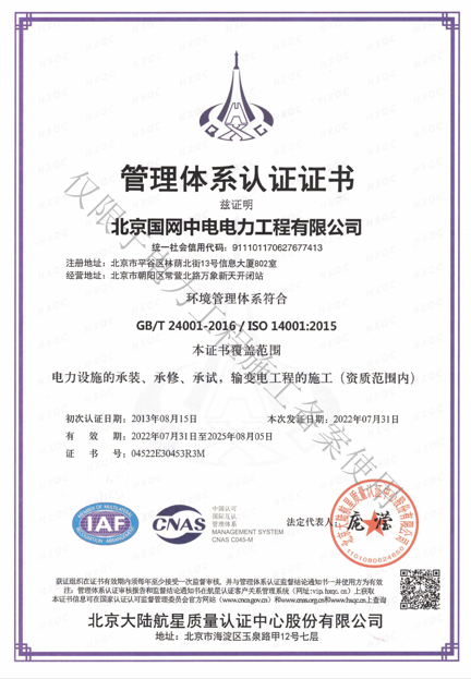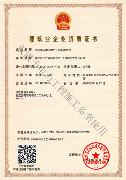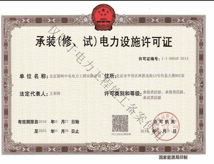 北京國(guó)網(wǎng)中電電力工程有限公司,已取得國(guó)家電監(jiān)會(huì)頒發(fā)的《承裝(修、試)電力設(shè)施許可證》、為電力施工承裝四級(jí)、承修四級(jí)、承試四級(jí)企業(yè)。北京市住房和城鄉(xiāng)建設(shè)委員會(huì)頒發(fā)的房屋建筑施工總承包二級(jí)、機(jī)電設(shè)備安裝工程專業(yè)承包二級(jí)、輸變電專業(yè)承包二級(jí)、城市及道路照明工程專業(yè)承包二級(jí)、市政公用工程總承包二級(jí)資質(zhì)、勞務(wù)不分等級(jí),已通過(guò)ISO9001:2015 GB/T50430-2017質(zhì)量管理體系、GB/T24001-2016/ISO 14001:2015環(huán)境管理體系、